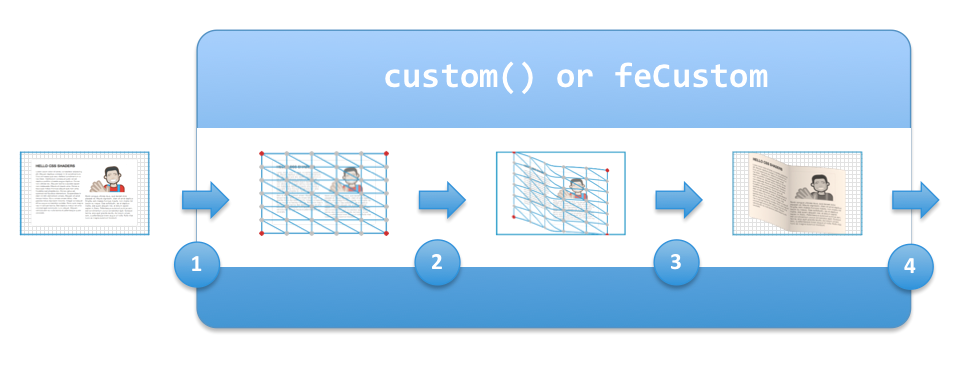 When applied to document content such as HTML or SVG elements, shaders can be used in very interesting ways. These 2D elements can conceptually be drawn on a mesh of vertices that can then be processed through a vertex shader for distortion and then to a fragment shader for pixel processing.